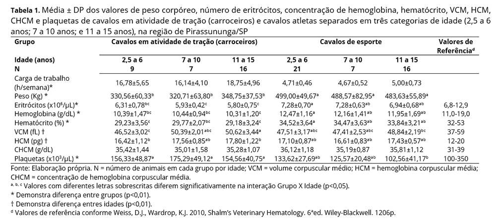 Atualmente, o médico veterinário se depara com resultados de exames hematológicos que devem ser comparados com valores de referência para a espécie adaptados da bibliografia internacional, baseados em exames de cavalos hígidos, com clima, nutrição e atividade física padronizados. A maioria dos estudos sobre o perfil hematológico de equídeos tem sido realizada em animais de elite, raças puras, os quais são alimentados adequadamente, mantidos em condições padronizadas, submetidos a exercícios e carga de trabalho controlado(3,4), ou a partir de raças específicas(5,6), enquanto que ainda são escassos os estudos com animais mestiços, utilizados para tração. Esses animais, a exemplo dos cavalos carroceiros, trabalham diariamente e muitas vezes sob condições precárias de nutrição e higidez. Tal fato faz com que surjam dúvidas quanto ao verdadeiro significado clínico dos resultados hematológicos obtidos dos equinos atendidos nas diferentes regiões do Brasil, em diferentes condições nutricionais e de higidez, realizando atividades físicas diversas.