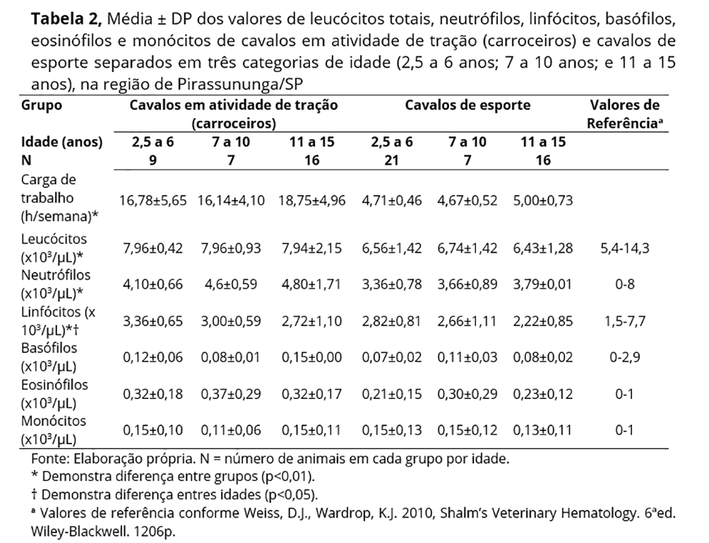 Além disso, os parâmetros utilizados para a interpretação dos exames hematológicos em equinos provêm da avaliação de animais com diferentes fatores envolvidos, como raça, idade, sexo, condicionamento físico, entre outros(7), além de fatores extrínsecos como, por exemplo, sanidade, manejo e intensidade da atividade física realizada(8,9). Sugere-se que esses parâmetros possam não ser representativos para valores específicos encontrados nas diversas categorias animais, como as categorias de animais de esporte equestre e animais carroceiros. Ressalta-se, então, a necessidade de se conhecer as variações dos parâmetros hematológicos para esses animais, a fim de se estabelecer valores de referência específicos para equinos destas categorias.