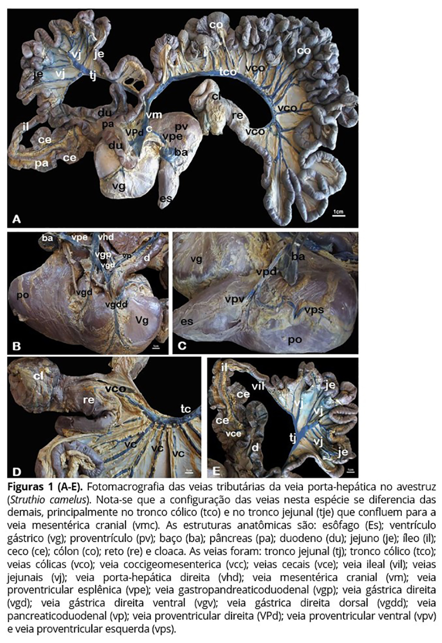 O sistema porta-hepático em avestruz (Struthio camelus) é formado pela união da veia porta-hepática direita e esquerda semelhante ao encontrado em Gallus gallus(17,18,19), em patos (Cairina moschata)(13,14), em gansos (Anser domestica)(13), em pombos domésticos (Columba livia domestica)(13,15,26), na garça-vaqueira (Bulbucus ibis)(16), em pato (Ana anas domesticus) e ganso (Anser anser domesticus)(22). Entretanto, em gansos (Anser domestica) e patos (Cairina moschata)(23) o sistema porta-hepático é formado por duas veias porta-hepáticas esquerdas e uma direita.