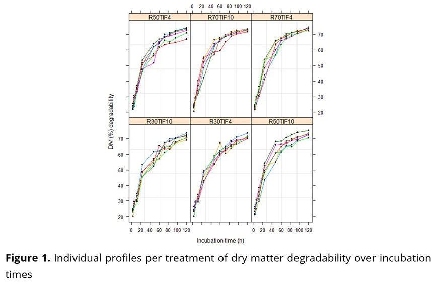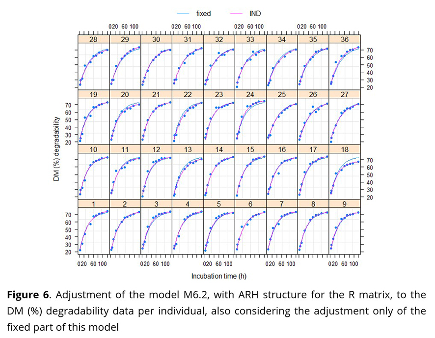 The individual profiles of dry matter (DM) degradability over time, per treatment (Figure 1), have similar behaviors, present some heterogeneity of variances over time and indicate that the nonlinear model (1) can explain well the relation between the percentage of DM degradation and the incubation times.