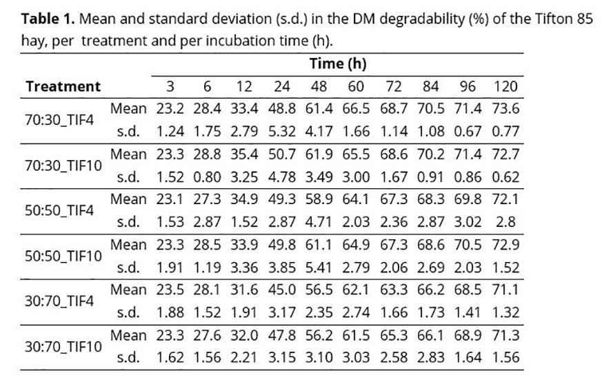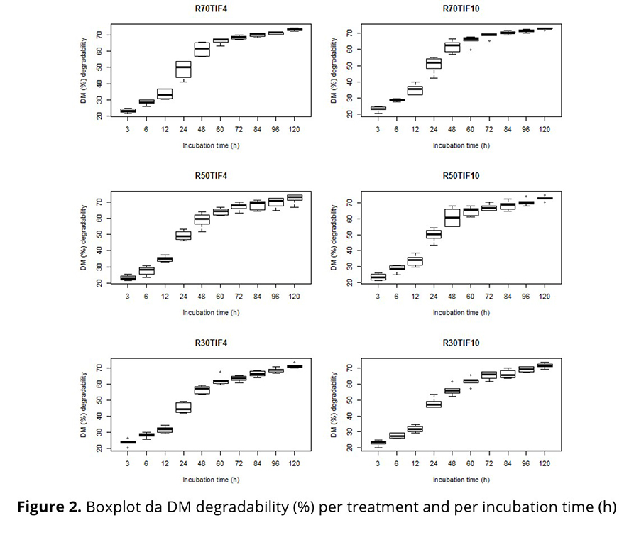 The basic experiment was planned in a 6×6 latin square with six animals at six distinct experimental periods, receiving one of the six treatments (R70TIF4, R70TIF10, R50TIF4, R50TIF10, R30TIF4 and R30TIF10). In all experimental units, repeated measurements were performed over time. Among the characteristics evaluated in the samples, the response variable considered in this work was the percentage of dry matter disappearance (%DM).