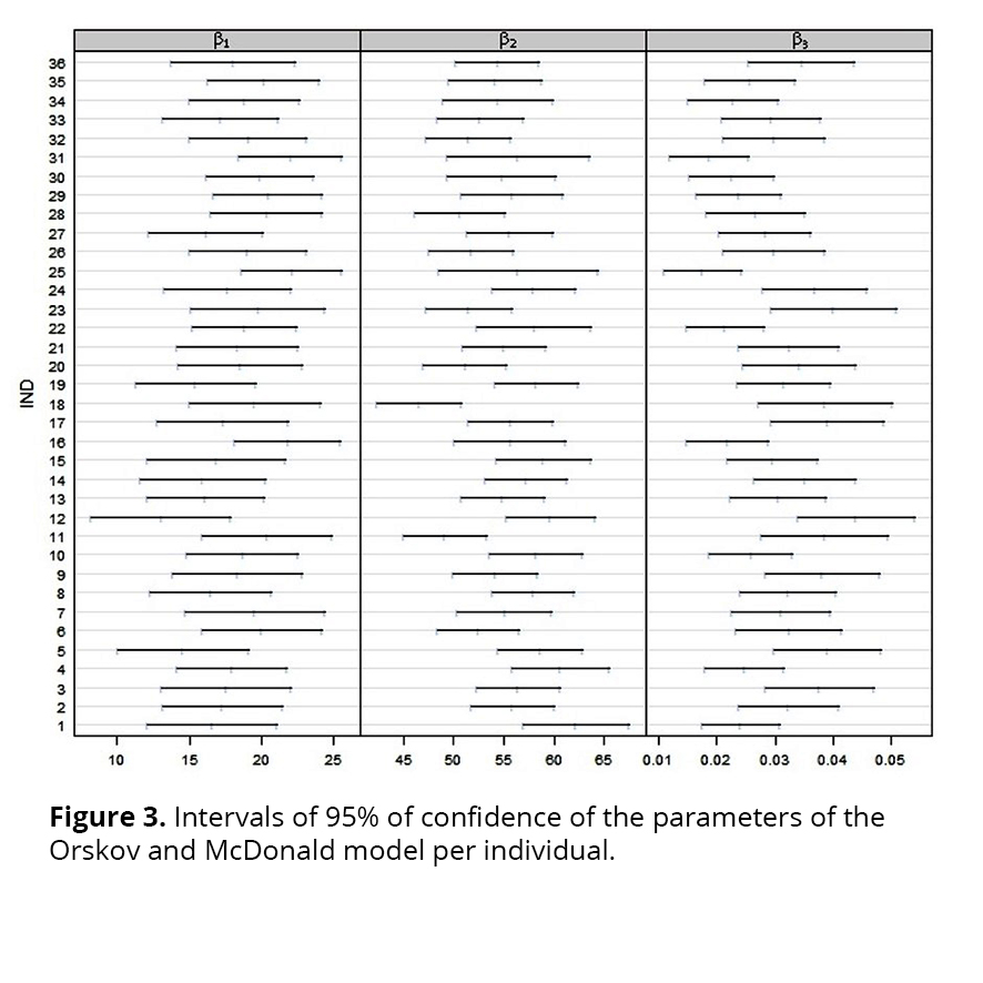 In order to suggest in which parameters it is convenient to include a random effect, the graphs of individual response profiles and of intervals of 95% of confidence were elaborated for each of the parameters of the nonlinear model, using the estimates of the parameters of the adjustments made for all individuals. An unusual variability of the points in some part of the graph of the individual response profiles (at the initial or final points of the process, or on the curvature of the profiles, for instance), associated to some parameter(s) of the nonlinear model chosen, suggests the inclusion of random effect in this/these parameter(s). On the other hand, in the graph of intervals of 95% of confidence, the non-overlap of the intervals calculated for a certain parameter indicates the inclusion of a random effect in this parameter(20).