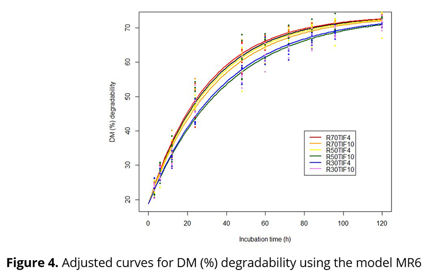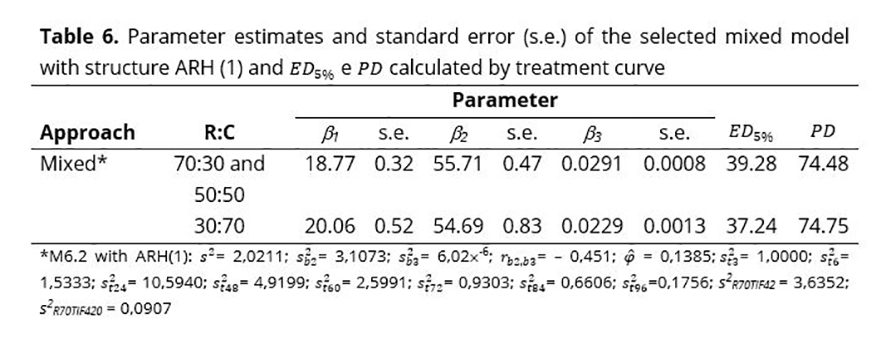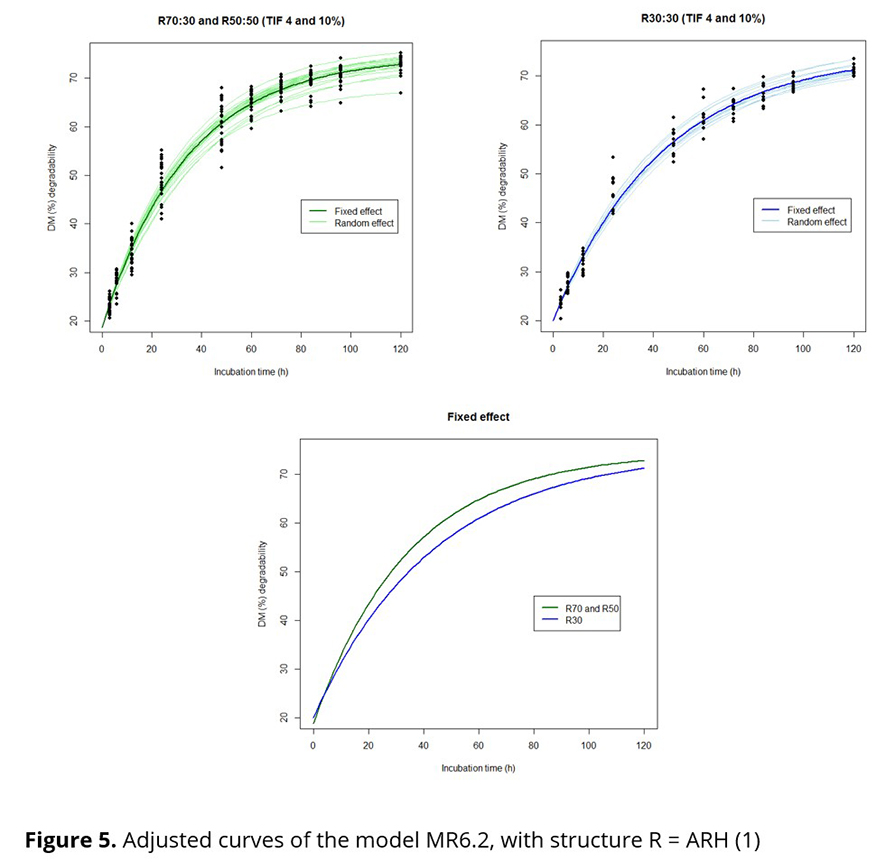 In Figure 4, which presents the mean curves adjusted to the six treatments, it is observed that the curves of treatments R30TIF4 and R30TIF10 are very similar, as well as the curves from the other treatments. Considering the random structure of model MR6 and the mean curves presented, some alternative models were proposed: i) MR6.5: five distinct curves, with a single curve for treatments R30TIF4 and R30TIF10 and one curve for each of the other treatments; ii)MR6.3: three distinct curves, comprising one for treatments R70TIF4 and R70TIF10, another for R50TIF4 and R50TIF10 and another for R30TIF4 and R30TIF10; iii) MR6.2: two distinct curves, one for treatments R30TIF4 and R30TIF10 and the other for the other treatments R70TIF4, R70TIF10, R50TIF4 and R50TIF10; iv) MR6.1: a single curve for all mean profiles. The models were compared using LRT and the criteria AIC and BIC and it was concluded that model MR6.2 with 10 parameters is as good as the other models, which involve 13, 19 or 22 parameters (Table 4). Therefore, the DM (%) degradability curves depending on the incubation times were considered identical for the roughage percentages of 70 and 50, with only the percentage of 30 considered different from the others. The nutritional quality of the Tifton 85 hays (TIF4 and TIF10) did not influence DM (%) degradability.