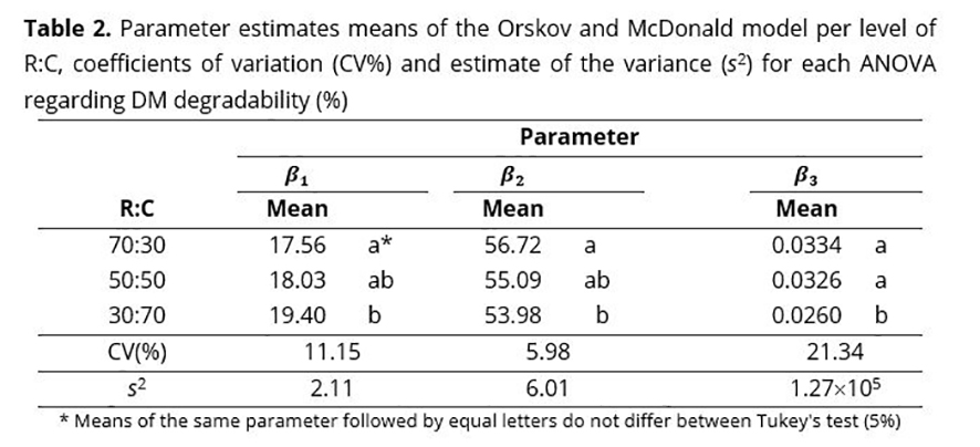 The coefficients of variation (Table 2) were considered medium-high for the parameters β1 and β3, and low-medium for the parameter β2 , according to the classification of Vaz et al.(24). By the Tukey's test, it was noticed that the animals which received 70% of roughage in the feed presented a higher value of β2 and a lower value of than the animals which received only 30% of roughage. The treatments with 70 and 50% of roughage presented mean β3 values equal to each other and superior to that of the treatment with 30% of roughage.