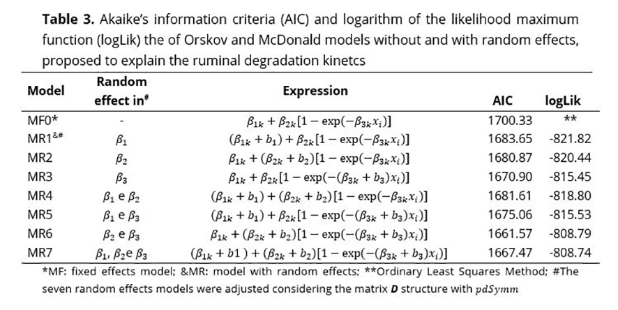 The intervals of 95% of confidence developed for the three parameters from the adjustments of the model for the 36 individual profiles of DM(%) degradability (Figure 3) suggest the inclusion of random effect in β2, β3 and, possibly, in β1, since the number of non-overlapping intervals for this parameter is small. To confirm these suggestions, seven models with random effects were suggested (Table 3).