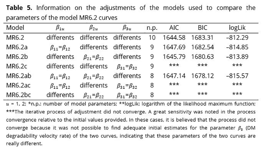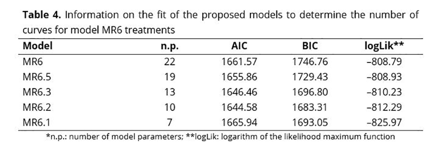 The parameters of model MR6.2 were also compared using the models presented in Table 5. Likelihood ratio tests were performed and allowed the conclusion that model MR6.2 with two curves and distinct parameters was the most indicated for the description of the response variable under study.
