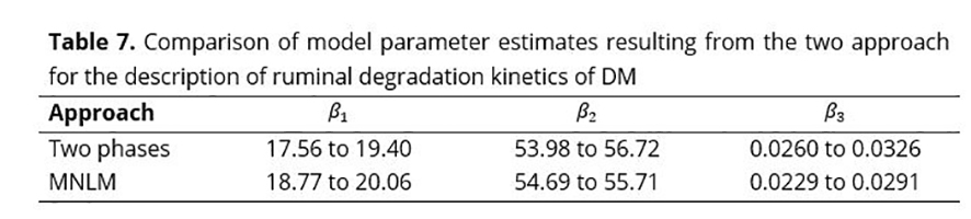 Although this study suggests that, for reducing the estimate of residual variability (s²), the use of MNLM is better than the method in two phases to differentiate the effective and potential degradability of foods, it is necessary to perform simulations to prove such affirmation.
