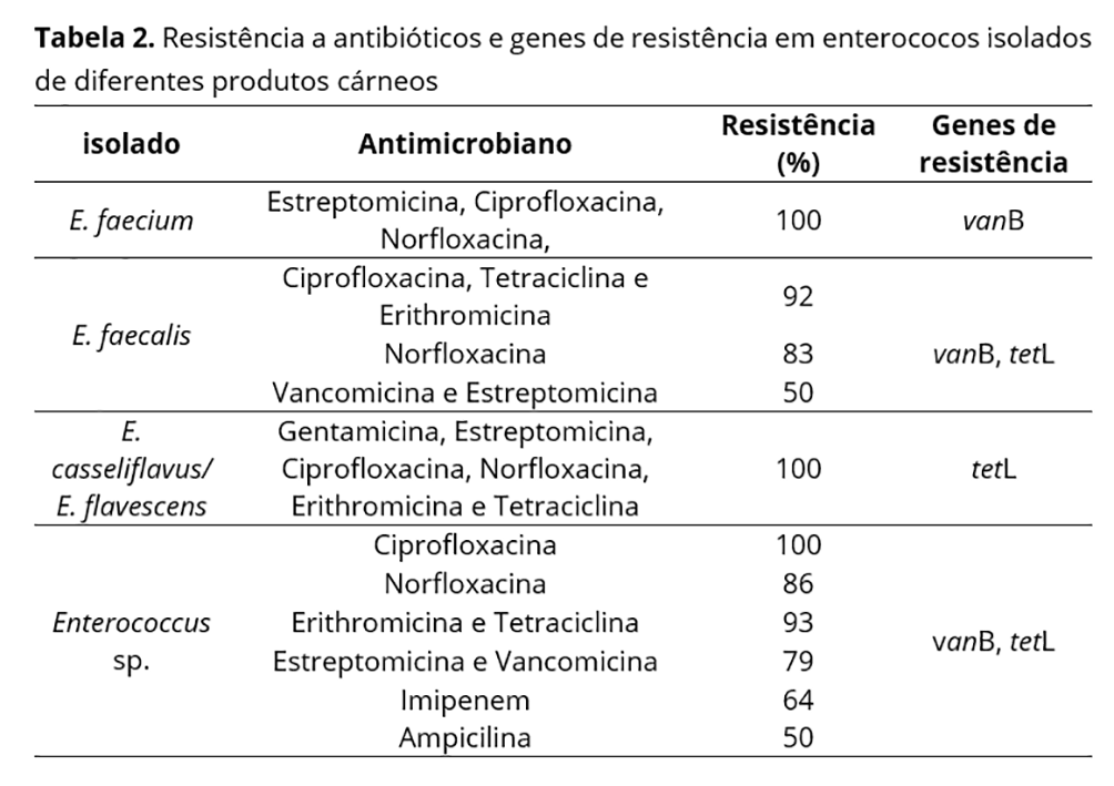 A transmissão de Enterococcus spp. pode ocorrer via alimento, porém ainda há poucas informações sobre a diversidade e distribuição de resistência nas espécies de Enterococcus isoladas da região norte do Paraná-Brasil. Este estudo fornece a primeira análise detalhada da resistência a antibióticos em uma variedade de enterococos isolados de carnes cruas e processadas nesse estado. Os enterococos devem ser considerados não apenas patógenos em potencial, mas também reservatórios de genes que codificam a resistência a antibióticos, que podem ser transferidos para outros microrganismos. O monitoramento contínuo de sua incidência e resistência emergente é importante para identificar alimentos que potencialmente representam um risco para a população e para garantir o tratamento eficaz de infecções enterocócicas humanas.