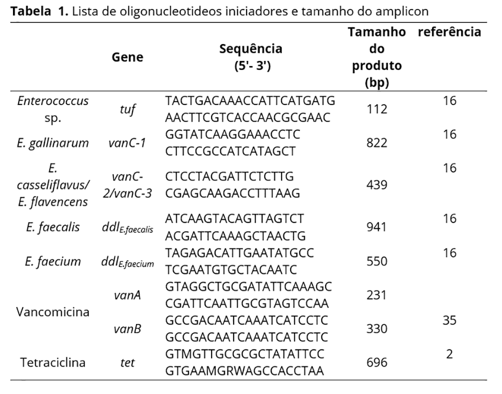 O DNA genômico foi extraído pela técnica da fervura(14). A identificação de enterococos e a detecção de genes de resistência foram confirmadas pela Reação em Cadeia da Polimerase (PCR), utilizando iniciadores específicos e direcionados, previamente relatados(16) (Tabela 1). Todas as reações no termociclador (Bio-Rad Thermal Cycles T100TM) foram realizadas com um volume final de 20 μL e consistiam em 2 μL de DNA total (20 ng mL-1), 11,5 μL de água ultrapura, 2 μL de tampão Taq (10X ), 1 μL de MgCl2 (2,5 mM), 1,4 μL de dNTPs (0,17 mM), 1 μL de cada iniciador direto e reverso (20 μmol) (Tabela 1) e 0,1 μL de Taq DNA polimerase (1 U) (Invitrogen). O programa utilizado consistiu em 5 minutos de desnaturação a 95 °C , seguido de 30 ciclos de 30 s a 95 °C, 30 s a 56 °C, 30 s a 72 °C, e extensão final a 72 °C por 5 min. Os amplicons foram separados por eletroforese em géis de agarose a 1% contendo brometo de etídio, e a visualização por luz UV foi realizada por um sistema fotográfico computadorizado (BioDoc-it System, UVP). Um marcador de DNA de 100 pb (escada de DNA de 100 pb, New England Biolabs / EUA) foi usado para estimar o tamanho do produto amplificado.