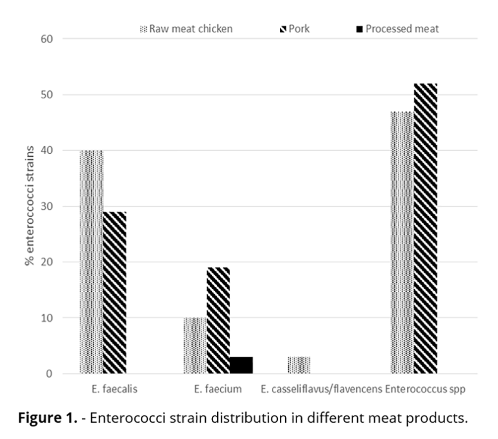 The data presented here reveal new avenues to study a possible role for the presence of Enterococcus spp. in the food chain, especially in raw and processed meat. It is, therefore, essential to investigate additional food samples to determine the potential risk to the population.