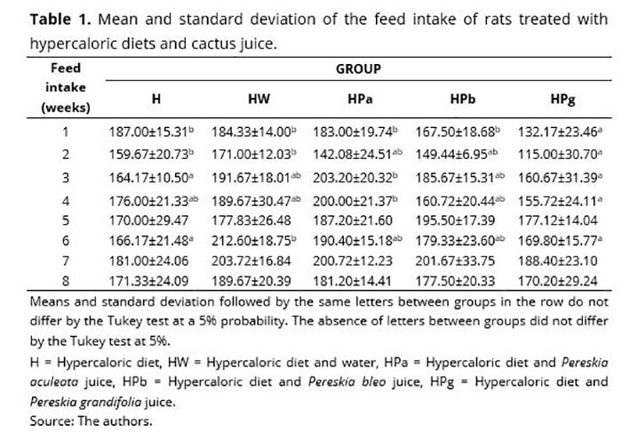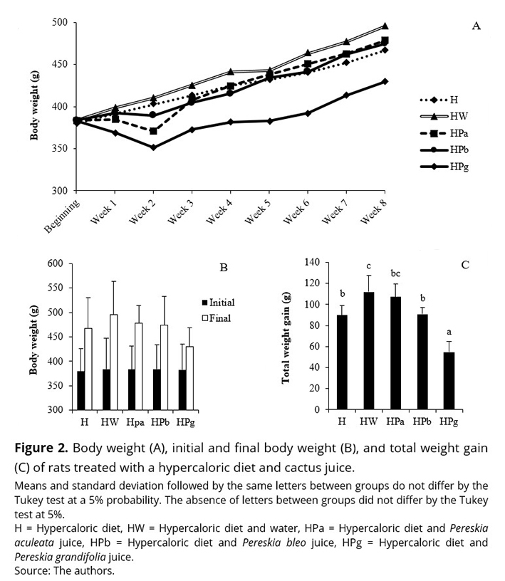 The average body weight showed no statistical difference between groups (Figure 2), differing from other studies with Wistar rats(20,21), in which the cacti reduced this physiological parameter. Rats fed a hypercaloric diet with 5 and 10% Pereskia grandifolia flour reduced body weight(3).
