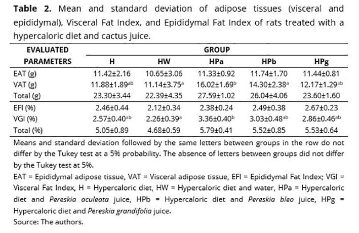 The use of monosodium glutamate and glucose solution, in association with the hypercaloric diet, changed only the total weight gain when comparing the H and HW groups. The means of the average and weekly feed intake, the total weight gain, visceral adipose tissue mass, and the Visceral Fat Index showed a statistical difference when comparing the HW group (monosodium glutamate, sucrose solution, and water) with those that received juice from cacti. The administration of monosodium glutamate (2 to 4 mg / g of body weight) in newborn rats destroyed the ventromedial arcuate nucleus of the hypothalamus and promoted obesity due to the lack of control between macronutrient absorption and energy expenditure(6). The sucrose solution (30%) in association with a balanced diet for rats increased adipose tissues (visceral and epididymal)(7).