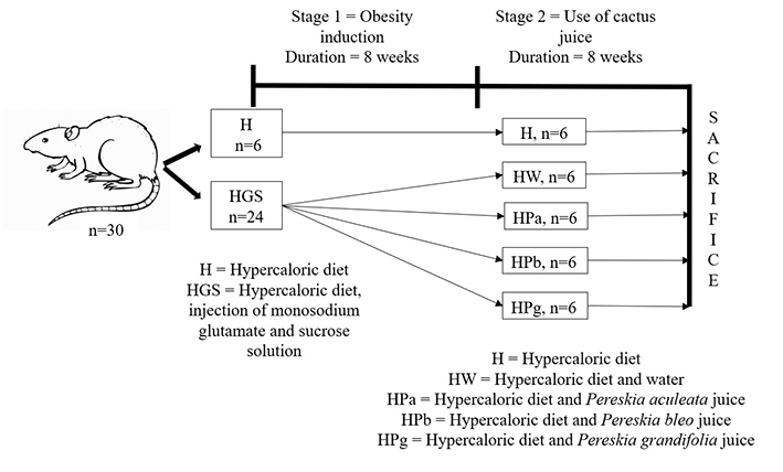 Leaves of the three species of the genus Pereskia (Pereskia aculeata, Pereskia grandifolia, and Pereskia bleo) were collected in a household in the municipality of São Gonçalo do Abaeté, MG, Brazil. Subsequently, the leaves were washed and sanitized with 200 ppm sodium hypochlorite solution for 10 minutes to prepare the juices in the proportion of 90% mineral water and 10% thin slices of each Pereskia leaf. The ingredients (water and slices) were ground in a domestic blender and filtered through a paper filter to be offered to the rats via gavage. The HW group rats received water via gavage, following the same procedures adopted for the juice groups.
