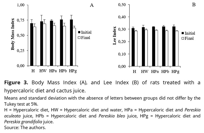 The means of Lee's Body Mass Index did not differ (p>0.05) between groups at the end of the study (Figures 3A and 3B), as observed by Souza et al.(17) who did not identify differences in the Lee Index among rats (male and female) treated with Pereskia aculeata juice. However, rats fed a hypercaloric diet containing 5 or 10% Pereskia grandifolia flour reduced these Indexes(3). The intake of caloric foods with a low nutritional value increases the Body Mass Index and the Lee Index, as well as contributes to the emergence of chronic non-communicable diseases(22).