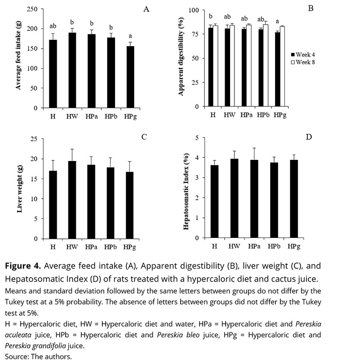 The average liver weight (Figure 4C) and the Hepatosomatic Index (Figure 4D) showed no statistical difference, suggesting that the cactus juice did not interfere with these parameters. However, Almeida et al.(3) identified that the Pereskia grandifolia flour reduced the weight of this organ. The increase in liver weight can contribute to the development of liver diseases and other chronic diseases, as metabolic changes in this organ promote systemic cellular changes(25).