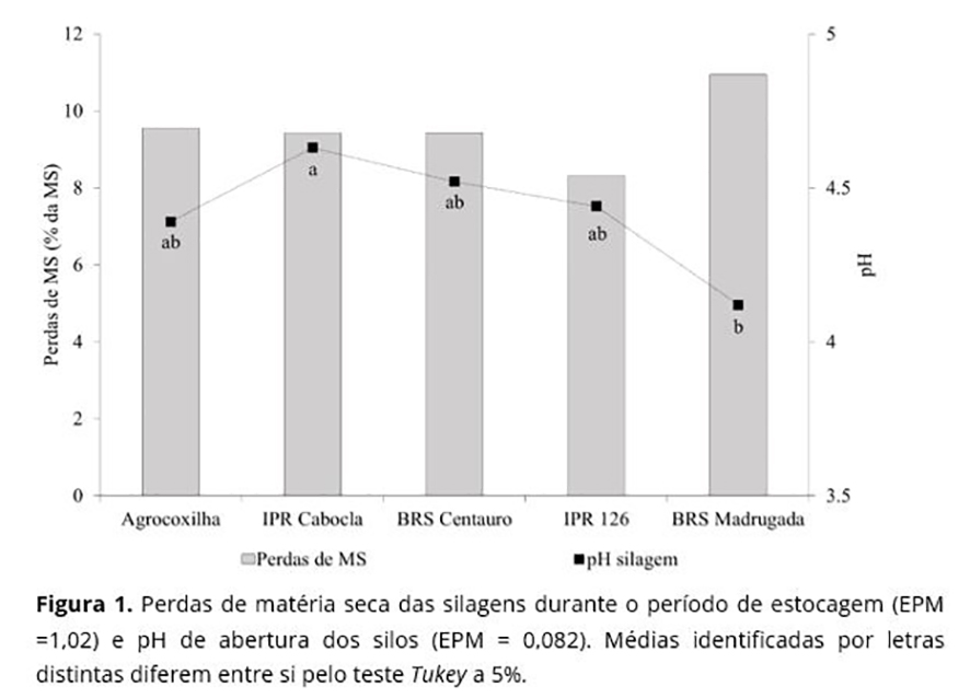 Os valores de pH foram influenciados pelo teor de MS ao momento do corte, sendo o maior valor observado para a aveia preta IPR Cabocla, valor que se distinguiu somente do observado na silagem do cv. Madrugada (Figura 1). Contudo, não foram observadas quaisquer diferenças com relação às perdas de MS na ensilagem.