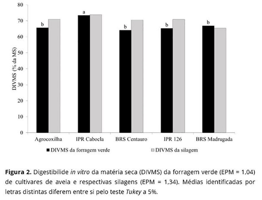 A fração FDA está relacionada à digestibilidade do alimento(23), o que pode ser observado pelos resultados obtidos para DIVMS (Figura 2), uma vez que o genótipo IPR Cabocla apresentou, previamente à ensilagem, simultaneamente, o menor conteúdo de FDA, assim como a DIVMS mais elevada. Contudo, a ensilagem acabou por igualar a digestibilidade dos materiais avaliados neste estudo, provavelmente devido à oxidação de compostos solúveis(24). Com relação a PB, o uso de cereais de inverno em dietas para ruminantes se torna de interesse, uma vez que gramíneas de clima temperado possuem metabolismo C3, apresentando maiores proporções da enzima Rubisco, o que eleva a quantidade de nitrogênio nos tecidos vegetais em comparação a gramíneas C4(25). Os cultivares avaliados neste estudo apresentaram valores satisfatórios de PB e condizentes com os observados em outros estudos avaliando a qualidade nutricional da aveia preta(15, 26). A produção de MS dita a quantidade de material disponível para alimentação dos animais, estando diretamente relacionada aos custos de produção (kg ha-1). Contudo, como o processo de ensilagem tende a modificar algumas características do alimento, devido à proliferação de microrganismos e consumo de substrato solúvel, estas alterações, junto às perdas inerentes ao processo, devem ser levadas em consideração para fins de planejamento.