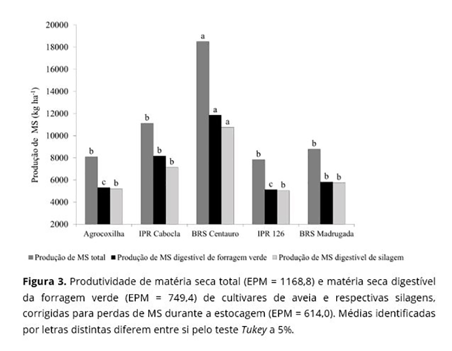 Desta forma, uma medida interessante adotada como variável neste trabalho seria a avaliação da produção de substrato digestível (kg ha-1), levando-se em consideração as perdas de MS em detrimento da produção de MS isolada. Como pode ser observado pelos resultados apresentados pela Figura 3, houve uma ligeira queda na produtividade nos cultivares avaliados quando levados tais quesitos em consideração. Contudo, é possível se ter uma real noção do potencial produtivo de cada forragem, uma vez que, se levados em consideração somente os resultados prévios à ensilagem, o genótipo IPR Cabocla se destacaria entre os demais. Porém, os dados obtidos demonstram um resultado oposto, no qual o genótipo BRS Centauro se destaca dos demais, com uma produção de MS digestível de 10 t por hectare, valor acima da média observada nos estudos supracitados, em que a produção de MS foi avaliada isoladamente.