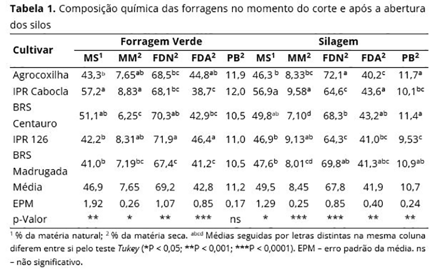 Nota-se que as diferenças entre cultivares se fazem presentes também com relação à composição química das forragens verdes, avaliadas previamente à ensilagem. Foi observado para o cv. Centauro o menor teor de matéria mineral (p<0,05), valor distinto somente dos apresentados pelos cultivares BRS Centauro e Madrugada. Com relação ao conteúdo fibroso, observou-se que os cultivares BRS Madrugada, IPR Cabocla e Agrocoxilha apresentaram os menores valores para FDN. Para a fração FDA, notou-se também que o cv. BRS Madrugada, assim como os cultivares IPR Cabocla e BRS Centauro foram detentores dos valores mais baixos para esta variável. No momento da colheita, os cultivares avaliados neste estudo não apresentaram diferenças significativas com relação ao conteúdo de PB. As silagens provenientes dos cultivares IPR Cabocla e IPR 126 não se diferenciaram com relação a MM, contudo elas se distinguiram quando comparadas aos cultivares BRS Centauro e BRS Madrugada. A silagem do cv. Agrocoxilha foi detentora do maior valor para FDN, que foi semelhante somente quando comparada ao cv. BRS Madrugada. O maior teor de FDA foi encontrado para o cv. IPR Cabocla, seguido dos cultivares BRS Centauro e Madrugada. Os valores de PB sofreram alteração após a ensilagem. As silagens provenientes dos cultivares IPR Cabocla e IPR 126 foram as detentoras dos menores valores de PB.