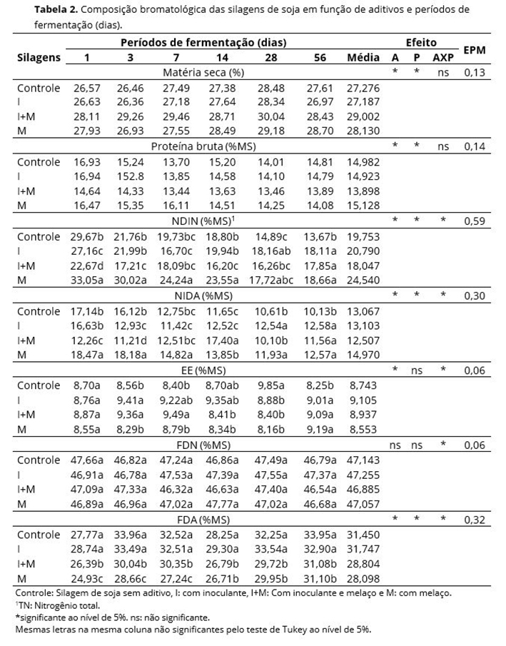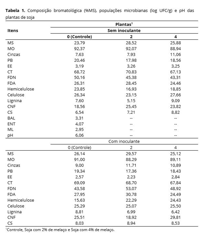Foi avaliada a composição bromatológica em silagens de soja com inoculante e melaço. Para determinar a composição bromatológica das silagens, os silos foram abertos após 60 dias de fermentação para a determinação de teores de matéria seca (MS)(5); matéria orgânica (MO) determinada pela diferença da MS e as cinzas(5); proteína bruta (PB) obtida pela determinação do N total, utilizando a técnica de micro-Kjedhal(6) e uma conversão fixa do fator (6,25); extrato etéreo (EE) em Goldfish com éter de petróleo; fibra insolúvel em detergente neutro (FDN)(7); fibra insolúvel em detergente ácido (FDA)(6); fibra insolúvel em detergente neutro corrigida para cinza e proteína (FDNcp)(8); nitrogênio insolúvel em detergente ácido (NIDA)(8); lignina em detergente ácido por imersão dos sacos contendo resíduo FDA em H2SO4 12M durante três horas(6).