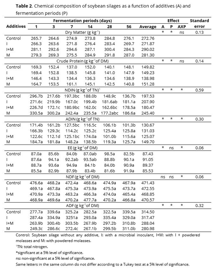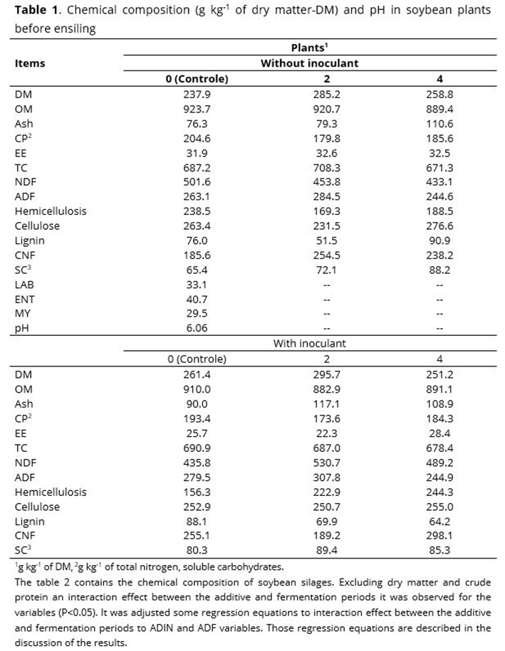 Research on soybean silage is still incipient in Brazil despite the increasing demand for information by local farmers. Therefore, this study aimed at assessing the chemical composition in soybean silages treated with microbial inoculant and molasses.
