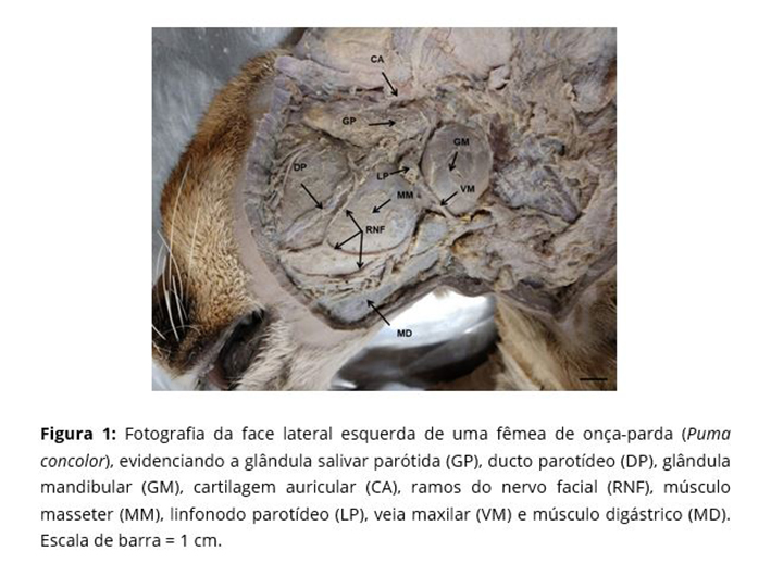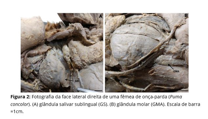 Dada a importância dos estudos anatômicos descritivos e a escassez de informações detalhadas a respeito dos aspectos anatômicos em animais silvestres, a proposta do presente estudo foi descrever anatomicamente as glândulas salivares maiores: parótida, mandibular, sublingual e molar na onça-parda (Puma concolor). Este trabalho será o primeiro a descrever anatomicamente as glândulas salivares presente nesta espécie, fornecendo resultados para novas considerações e implicações sobre esses órgãos. A descrição anatômica das glândulas salivares em animais silvestres é importante, pois auxiliará em tratamentos clínicos dessas espécies, gerando informações úteis especialmente para profissionais que atuam em zoológicos e unidades de conservação(13).