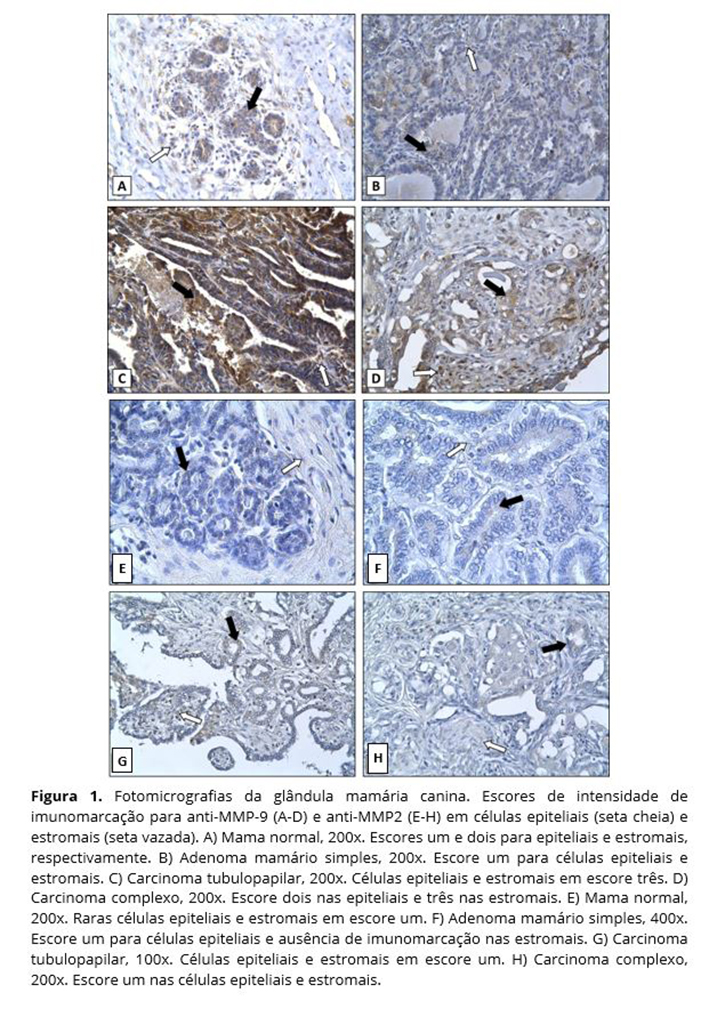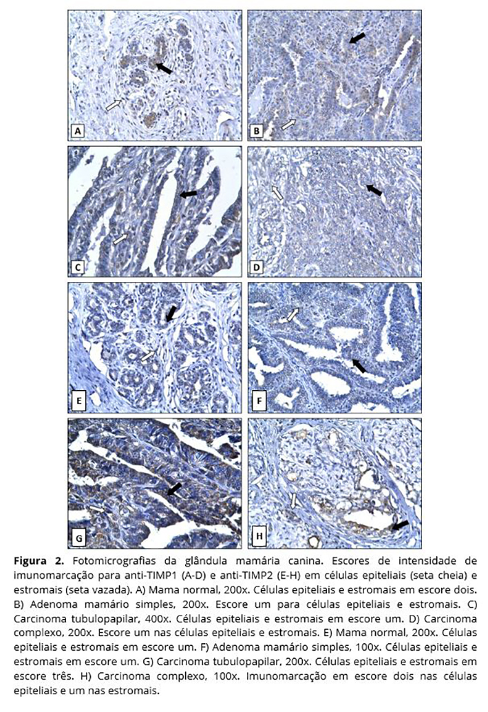 Em humanos, imunoexpressão aumentada de MMP em diferentes tumores, especialmente MMP-2 e 9, está associada a maior grau de indiferenciação histológica, estágio tumoral avançado, maior risco de metástase e morte(18-21), o que também é observado nos tumores de mama(18, 22, 23). De outra parte, em cães, a imunoexpressão de MMP e seus inibidores no tecido mamário neoplásico ainda não é bem elucidada. Contudo, há descrição de maior imunomarcação de MMP, principalmente MMP-2 e MMP-9, e redução de TIMP no tecido mamário neoplásico em relação ao normal(24, 25). Aresu et al.(26) relacionaram MMP-2 e MMP-9 como tendo um importante papel na malignidade do tumor de mama em cadelas; já Wu et al.(27) concluíram que cadelas com alta concentração de MMP-9 e baixa de TIMP-1 possuem maior taxa de metástase para linfonodos, maior progressão neoplásica e menor taxa de sobrevida global.