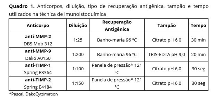 Na sequência, os cortes foram submetidos à recuperação antigênica, seguida do bloqueio da peroxidase endógena em solução metanólica de H2O2 a 3%, por 15 minutos. Para bloquear reações inespecíficas, as lâminas foram incubadas em solução de leite em pó desnatado (Molico®) a 30%, por 1h30min, seguindo-se a incubação com os anticorpos anti-MMP-2, anti-MMP-9, anti-TIMP-1 e anti-TIMP-2, em câmara úmida, durante 18 horas, a 4 °C (Quadro 1).