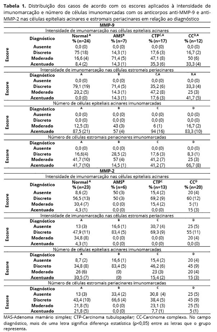 Na avaliação imunoistoquímica consideraram-se a intensidade da imunomarcação e o número de células marcadas para MMP-2, MMP-9, TIMP-1 e TIMP-2 no epitélio acinar e estroma periacinar. A intensidade da imunomarcação dos anticorpos foi avaliada de forma semiquantitativa, seguindo o modelo de Aresu et al.(26), utilizando os escores de zero a três, sendo zero ausência de imunomarcação e um, dois e três imunomarcação discreta, moderada e acentuada, respectivamente. Na quantificação das células epiteliais acinares e estromais periacinares consideraram-se o escore zero quando da ausência de imunomarcação, e os escores um, dois e três quando da imunomarcação de células em 1-33%, 34-66% e 67-100% do tecido, respectivamente.
