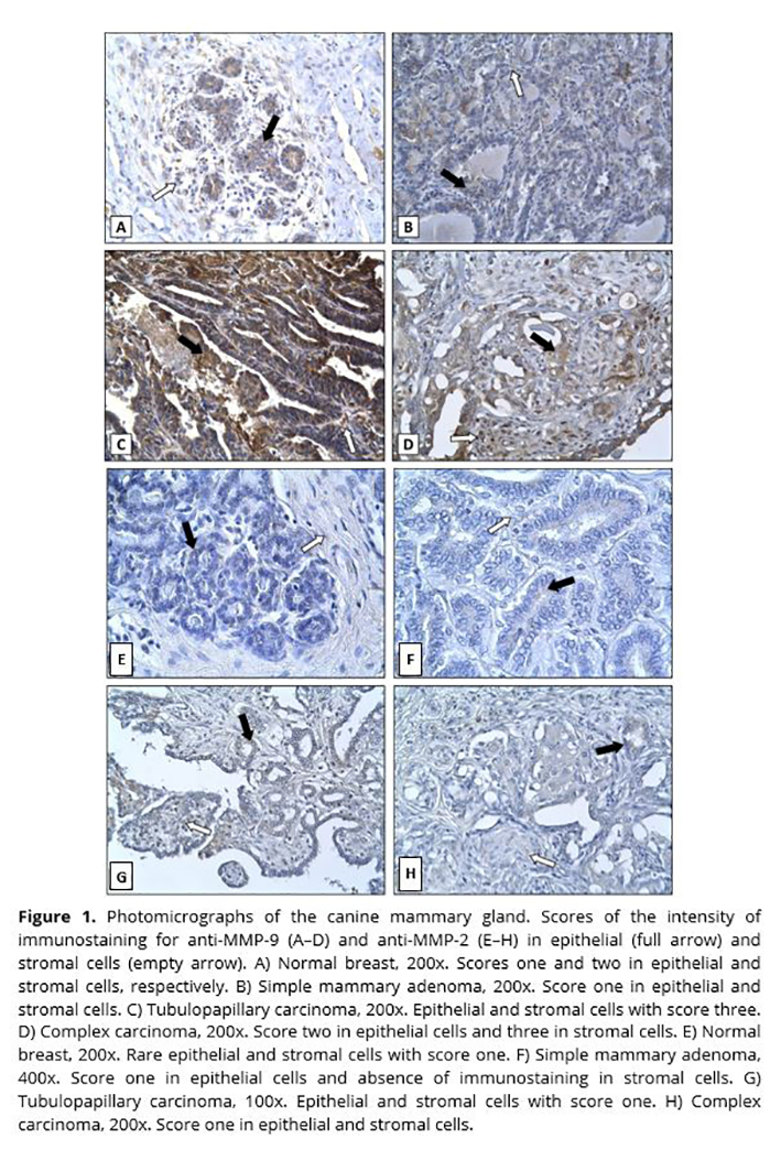 Balanced activity between MMP-9, MMP-2, TIMP-1, and TIMP-2 maintains normal canine mammary tissue homeostasis, while an increased immunoexpression of MMP-9 and TIMP-2 and reduced immunoexpression of TIMP-1 in carcinomas suggest a favorable condition for tumor evolution and invasion. Also, tissue concentration of MMP and its inhibitors in the breast of bitches vary according to the tumor type, the degree of malignancy, and the adjacent neoplastic and stromal cells, which may reveal a little more about the behavior of each neoplastic type and assist future studies regarding diagnosis, treatment, and prognosis.