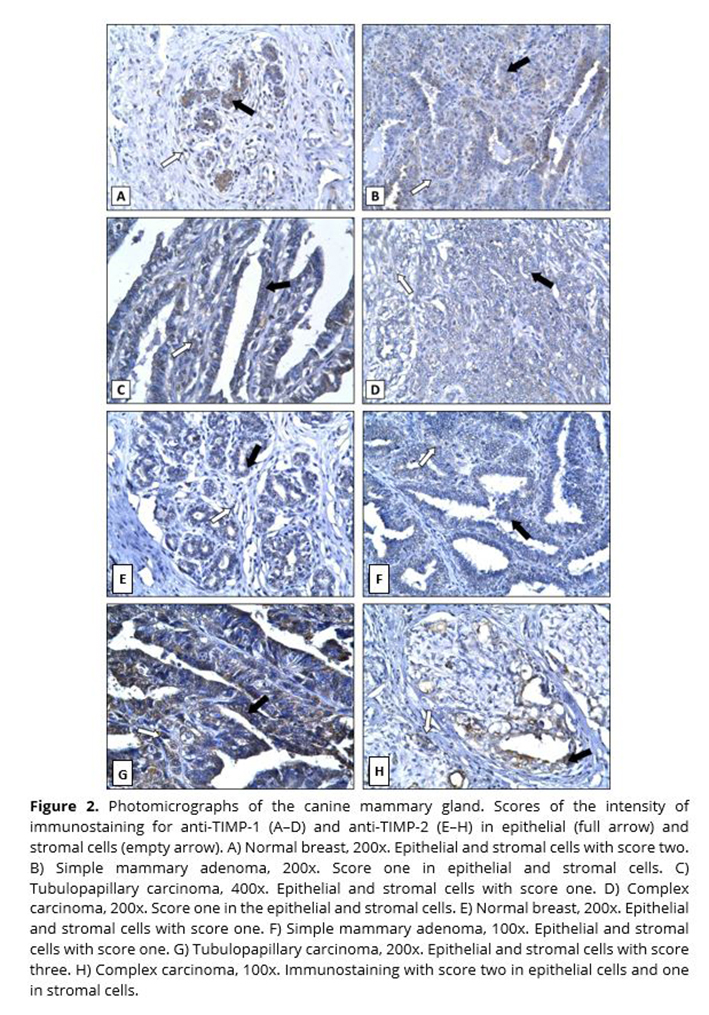 Therefore, this study aimed to perform the immunostaining of MMP-9, MMP-2, TIMP-1, and TIMP-2 to evaluate the behavior of these proteins in the ECM remodeling in normal and neoplastic canine mammary tissue.