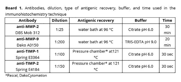 Then, the cuts were submitted to antigenic recovery, followed by the blocking of endogenous peroxidase in a methanolic solution of 3% H2O2 for 15 minutes. Nonspecific reactions were blocked by incubating the slides in a 30% skimmed milk powder (Molico®) solution for 1.5 hours, followed by incubation with anti-MMP-2, anti-MMP-9, anti-TIMP-1, and anti-TIMP-2 antibodies in a humid chamber at 4 °C for 18 hours (Board 1).