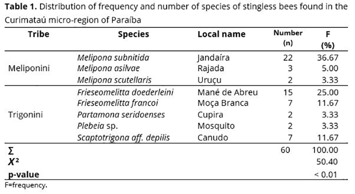 Sixty nests of stingless bees were found in four different municipalities of the Curimataú region of Paraíba (Araruna, Cacimba de Dentro, Damião, and Cuité). Bees (tribes Meliponini and Trigonini) corresponded to eight different species: Melipona subnitida Ducke, 1910, Melipona asilvae Moure, 1971 (Hymenoptera: Apidae), Melipona scutellaris Latreille, 1811 (Hymenoptera: Apidae), Frieseomelitta doederleini Friese, 1900 (Hymenoptera: Apidae), Frieseomelitta francoi Moure, 1946 (Hymenoptera: Apidae), Partamona seridoenses Pedro & Camargo, 2003 (Hymenoptera: Apidae), Plebeia sp., and Scaptotrigona aff. depilis Moure, 1942 (Hymenoptera: Apidae). The most frequent species was M. subnitida (36.67%), followed by F. doederleini (25%), and Frieseomelitta francoi Moure, 1946 (Hymenoptera, Apidae) and S. aff. depilis, both with 11.67% (Table 1). A study carried out in Serra da Capivara, PI,(39) also observed the occurrence of these species.