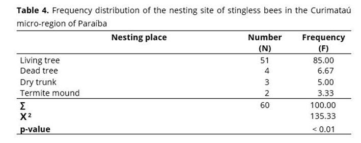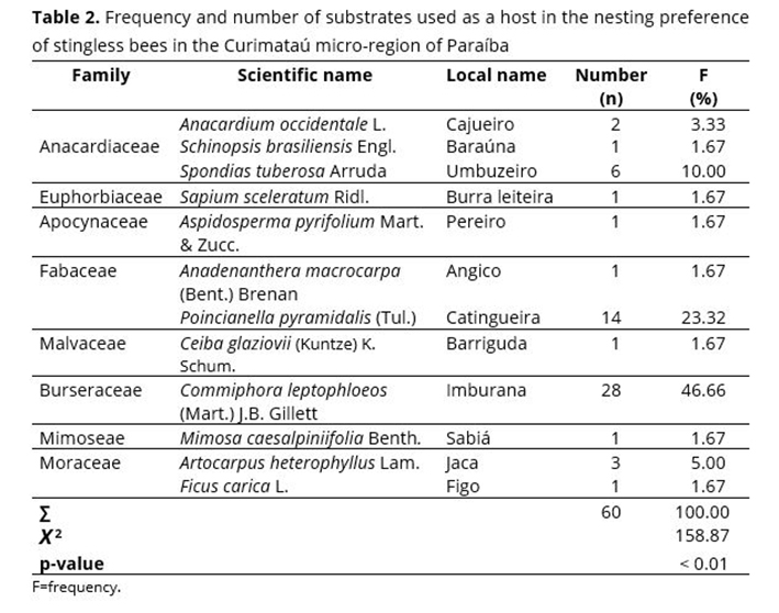 Although the hundreds of tree species in the Curimataú region, stingless bees have used a small number of them for nesting, i.e., only 12 species (Table 2). Stingless bee species are selective and opt for specific trees.(41)