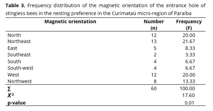 Stingless bees found in the Curimataú micro-region of Paraíba have a specific preference in the magnetic orientation. Cardinal and collateral points with variable orientation between Northeast and Northwest (Table 3) had a higher choice, with a frequency of 55%.