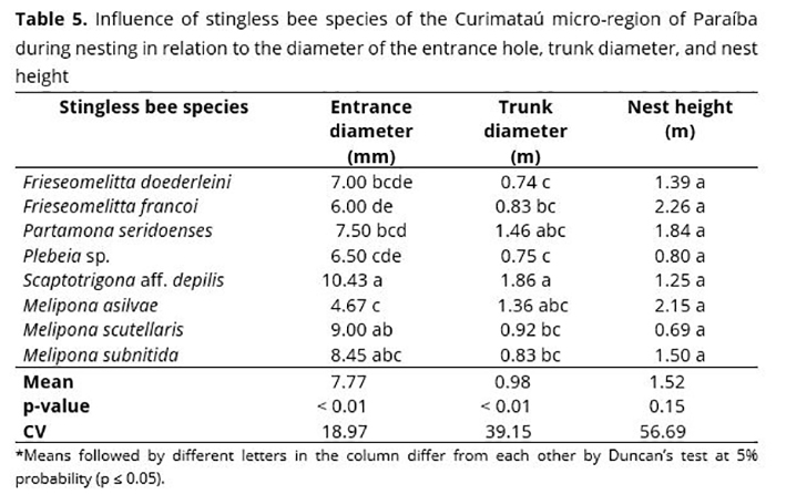 Trunk diameter was influenced by the studied stingless bee species, in which the highest values were found for S. aff. depilis (1.86 m), P. seridoenses (1.46 m), M. asilvae (1.36 m), and M. scutellaris (0.92 m), differing from M. subnitida, which ranged from 0.74 to 0.83 m (Table 5). Other studies have found different results, with diameter values ranging from 0.39 and 0.50 m.(40)