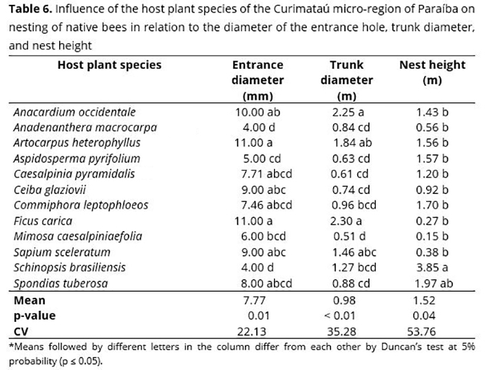 When comparing tree trunk diameter in relation to the influence of host plants (Table 6), it is observed that the largest diameters were presented by A. occidentale and F. carica, with 2.25 and 2.30 m, respectively, differing statistically from M. caesalpiniaefolia, which had the lowest value (0.51 m). A study conducted in the Forest Zone of Pernambuco showed that 50% of stingless bees nest in trees with a diameter lower than 50%, 30% with a diameter between 1 and 1.5 m, and 20% between 2 and 2.5 m.(47) Diameter variation of trees chosen for nesting of stingless bee species found in the Curimataú region of Paraíba may be related to the size of trees in the study area, with varying characteristics regarding size and architecture.