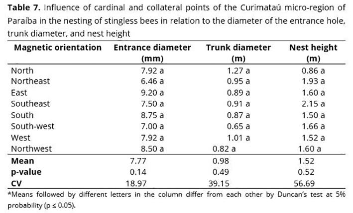 Nest height showed no significant difference regarding host tree species, even though it showed a maximum amplitude of 3.85 m for S. brasiliensis and minimum for M. caesalpiniaefolia, with 0.15 m of nest height in relation to the ground. Similar results were found in a survey conducted in Bahia with stingless bees,(48) in which nest height ranged from 0.5 to 3.8 m. Probably, nest height of stingless bees is not related to the size or type of trees, but rather to nesting characteristics of each bee species. The height of nest entrance hole in host plant species at the highest or lowest positions is due to chance.(31) Cardinal and collateral points showed no influence on the diameter of the entrance hole, trunk diameter, and nest height (Table 7).