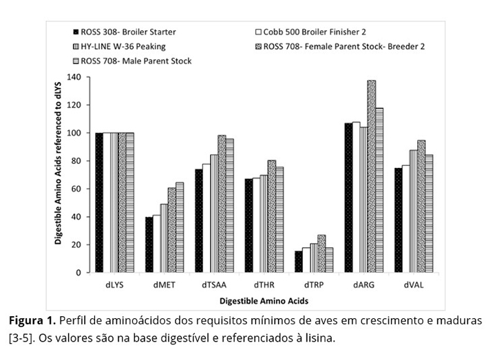 A proteína dietética é considerada um dos principais componentes do custo da alimentação de aves comerciais. Segundo Corzo et al.(1), a redução do nível de proteína na dieta e o uso de aminoácidos purificados suplementares tornam possível reduzir esse custo. No entanto, é importante tomar cuidado, pois a composição de aminoácidos (AA) nas dietas pode variar de acordo com fatores como inclusão de ingredientes, diferentes fontes de proteína, inclusão de AA sintético, concentrações desses AA, a proporção de AA: LIS, bem como a expressão de AA na base proteica total ou digestível(2).
