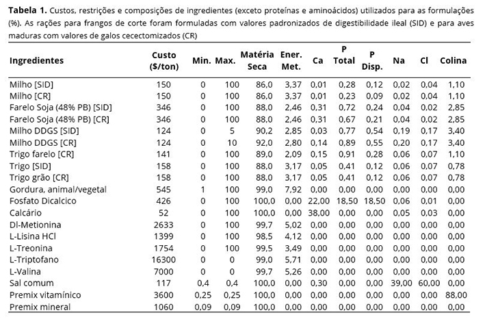 As dietas para frangos de corte foram formuladas com valores padronizados de digestibilidade ileal(9) e para aves maduras com valores de galos cecectomizados(10). Os valores dos custos dos ingredientes utilizados foram fornecidos por um grande integrador americano durante a primavera de 2017 (Tabela 1).
