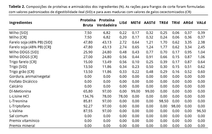 A matriz de composição de ingredientes utilizada nas formulações de ração foi compilada a partir das tabelas de análise de ingredientes da Revista de Ingredientes (Tabelas 1 e 2)(8).
