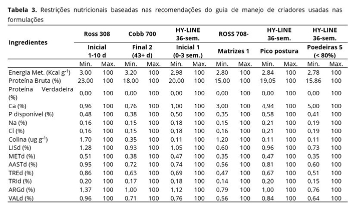 As dietas experimentais foram formuladas para: 1) frangos de corte fase inicial Ross 308 (1-10 d); 2) frangos de corte fase final Cobb 700 (43+d); 3) frangas na fase inicial Hy-Line (0-3 semanas); 4) Matrizes Ross 708 1; 5) Poedeiras pico postura Hy-Line (36-sem.) e 6) Poedeiras Hy Line (36-sem.) 5 (<80%), de acordo com os guias de gerenciamento de criadores (Tabela 3). As rações foram formuladas para atender às especificações nutricionais a um custo mínimo. A disponibilidade dos nutrientes foi a mesma para as várias rações formuladas, diferindo apenas nas exigências de proteína bruta ou lisina digestível: proteína verdadeira.