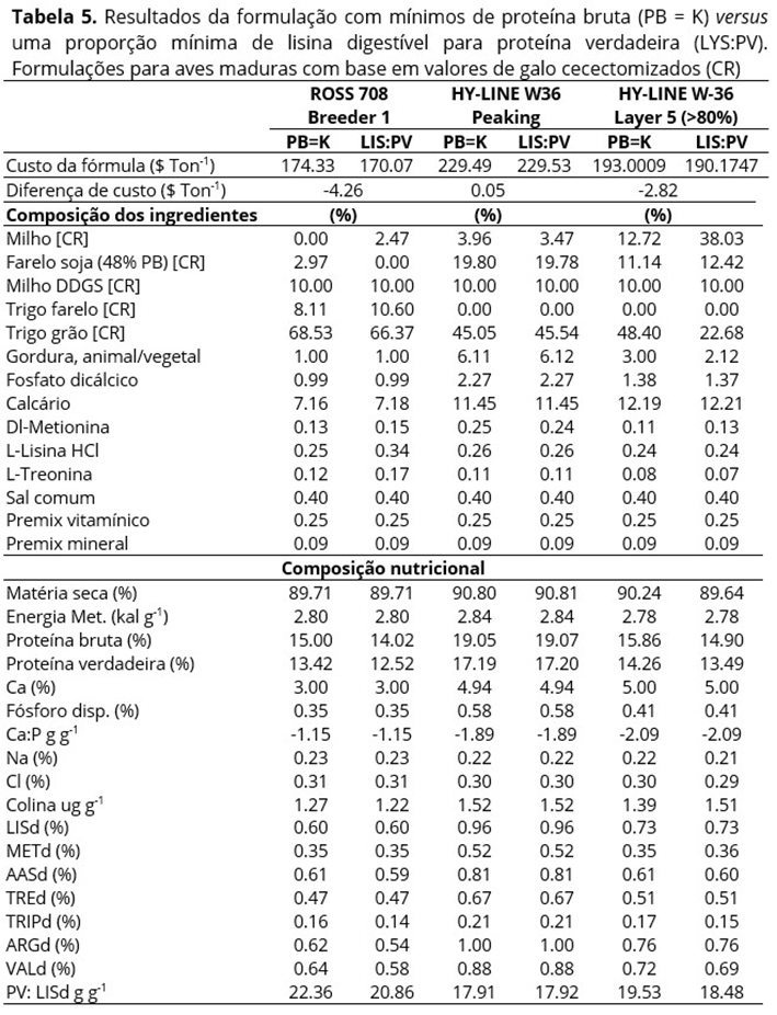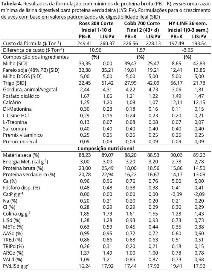 O uso da razão LISd para PV versus PB mínima para as dietas modelo alteradas modificou os custos da fórmula em $+10,96 (Frangos corte fase inicial Ross 308), $+1,57 (Frangos corte fase final Cobb 700), $-3,95 (Hy-Line 36-sem. – Inicial 1), $-4,26 (Ross 708 - Matrizes 1), $+0,05 (Hy-Line 36 sem. – Pico postura) e $-2,82 (Hy-Line 36 sem. – Poedeiras 5) por tonelada de alimento (Tabelas 4 e 5)