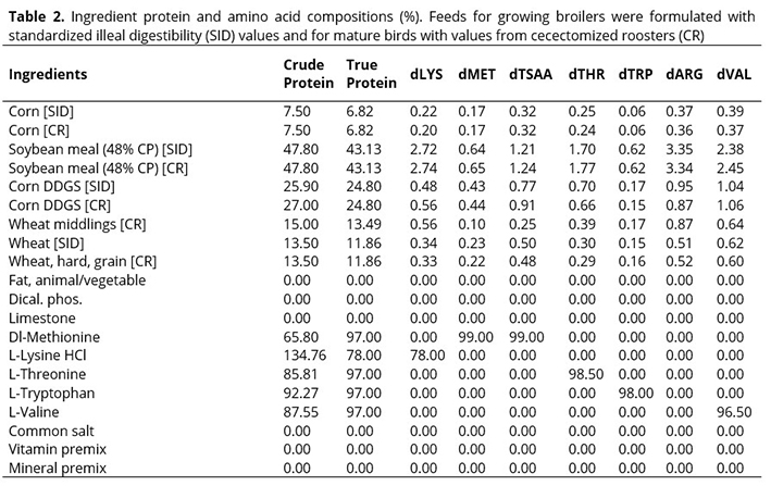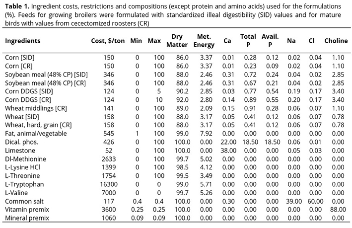 Diets for growing broilers were formulated with standardized illeal digestibility (SID)(9) values, and for mature birds with values from cecectomized roosters (CR)(10). The costs of the ingredients used were provided by a major American integrator during the Spring of 2017 (Table 1).