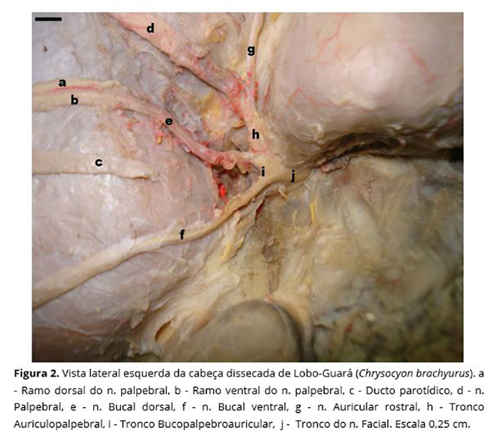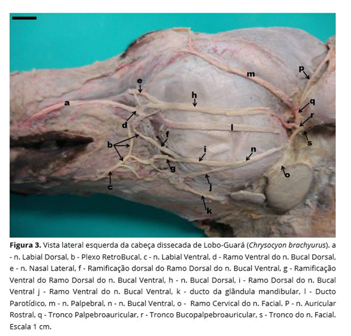 Em Lobo-Guará, o n. Bucal dorsal nasce em tronco comum com o n. Auriculopalpebral, Tronco Bucopalpebroauricular, sendo ele o seu ramo ventral (Figura 3). O n. Bucal dorsal está posicionado dorsalmente ao ducto parotídico, com o qual segue rostralmente sobre a aponeurose do m. Masseter. Ao nível da borda rostral do m. Masseter, dividia-se em Ramos dorsal, médio e ventral. O Ramo ventral encontrava-se fino e estabelecia anastomoses com o Plexo Retrobucal. Os Ramos médio e dorsal eram maiores e realizavam anastomoses entre si, contribuindo para a formação do Plexo Retrobucal. Após o plexo, o Ramo médio seguia rostralmente como n. Labial dorsal, enquanto o Ramo dorsal se direcionava para a face lateral do nariz como n. Nasal lateral.