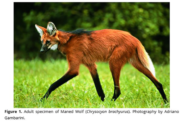 Maned Wolf (Chrysocyon brachyurus) is considered one of the largest and most beautiful canids in South America. It belongs to the phylum Chordata, order Carnivora, class Mammalia, and family Canidae. The species has very peculiar characteristics among canids, such as long and thin legs and dense reddish coat. They live in the Brazilian Cerrado and are predominantly nocturnal, solitary, and furtive animals, with twilight activity peak. They are omnivores and generalists, their food sources vary from animal origin (rodents, birds, eggs, reptiles, and insects) to plant origin (fruits, sugarcane, and honey)(1). Gestation lasts up to 65 days, with black newborns weighing between 340 and 430 g. Adults weigh between 20 and 30 kg and exhibit up to 90 cm at withers. Its greatest threat is the destruction of its habitat by anthropic action, which is why they are listed as an endangered species(2,3).