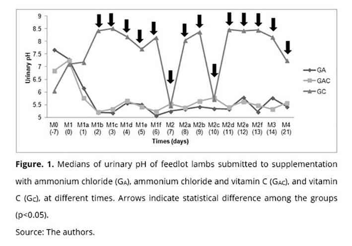 Under the conditions of the present study, ammonium chloride caused the most rapid decrease in the urinary pH of the lambs and kept it acidic throughout the study period. Ammonium chloride combined with vitamin C (GAC) showed similar effects regarding urine pH as observed in the group treated with only ammonium chloride (Ga). Due to the fluctuation in the urinary pH values observed in the group supplemented with ascorbic acid (GC), this was not an efficient treatment for maintaining urinary acidification.