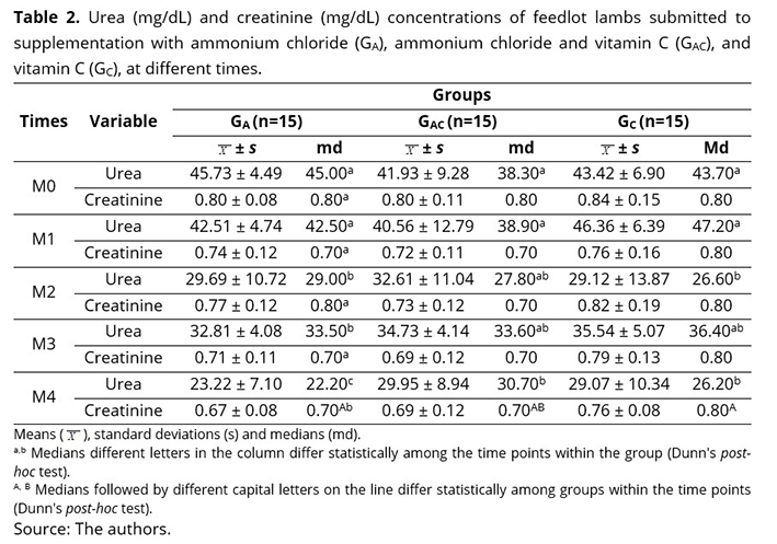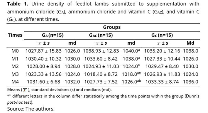The Ga group presented two animals with triple phosphate crystals, one in M1 (rare) and another in M3 (+), and one of amorphous urate in M3 (+++). In the GAC group, there was only one sheep with amorphous urate in M3 (+++). In the GC group, seven animals showed triple phosphate crystals, one in M2 (+), three in M3 (+++), and two in M4 (+), as well as one animal with amorphous urate in M4 (+++). Although the difference between the groups was not significant, it was noted that the animals in the GC presented crystalluria even after 15 d of treatment (M2), which persisted up to 21 d (M4) after the administration of vitamin C. Thus, it was noted that acidic urine, regardless of the four (4/150) samples in animals that received ammonium chloride (Ga and GAC), prevented the formation of these crystals. Crystals produced in urine are eliminated periodically and are only of diagnostic value if in large quantities or associated with clinical signs of urolithiasis(15,24,32). Since this disease was absent in this study cohort, the presence of crystals could be related to the diet rich in grains.
