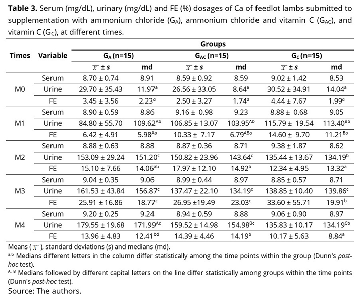 Over time, the urinary Ca concentration in the three groups increased from M0 to M2, then remained stable until M4. There was a statistical difference across the time points in the three groups, with the lowest median values at M0 and the highest at M4. This was not observed by Maciel et al.(29), who described a drastic reduction in urinary Ca excretion in Santa Inês lambs during confinement.