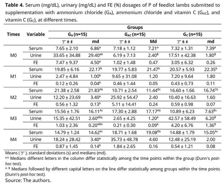 Regarding the dosage of urinary P (Table 4), there was a difference at M0, when the Ga group had a higher median than that of the others; however, at that time, the animals were adapting to the diet and the environment, and the administration of acidifiers had not begun. Diets rich in phosphorus cause an increase in serum phosphate, and consequently, an increase in its urinary excretion, which favors calculogenesis. However, in healthy ruminants, the excretion of phosphorus is also conducted via feces, whereas in the case of an increase in the serum concentration of this electrolyte, the excretion becomes urinary(45).